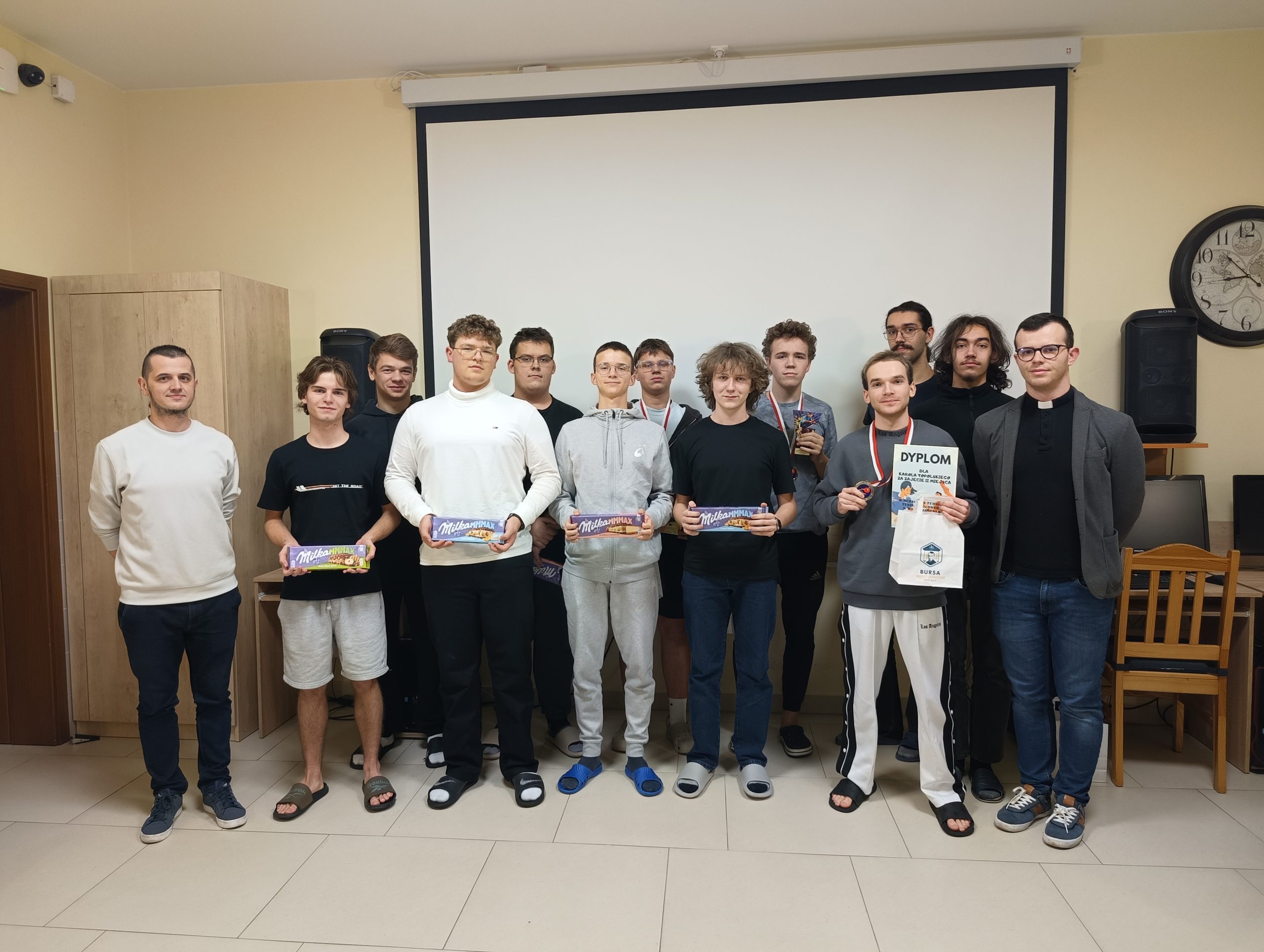 W czwartkowy wieczór, 4 grudnia, odbyło się uroczyste wręczenie nagród dla zwycięzców Turnieju Tenisa Stołowego, a także cząstkowych wyróżnień za szczególne dbanie o porządek w pokojach. Był to miły akcent podsumowujący ostatnie tygodnie aktywności wychowanków. Uroczystość poprowadził ksiądz Janek – Prefekt Bursy, który w imieniu Ojca Dyrektora Damiana przekazał nagrodzonym dyplomy oraz drobne upominki. W krótkim przemówieniu podkreślił zaangażowanie uczestników zarówno w rywalizację sportową, jak i w codzienne obowiązki związane z utrzymywaniem czystości. Atmosfera podczas spotkania była wyjątkowo serdeczna. Uczestnicy z zainteresowaniem wysłuchali ogłoszenia wyników, a radość zwycięzców udzielała się wszystkim obecnym. Największe brawa zebrał Maksym – triumfator turnieju. Oprócz głównej nagrody otrzymał także od Bursy firmową filiżankę jako symboliczne wyróżnienie za to, że stał się pomysłodawcą i nieformalnym inicjatorem wieczornych herbatek w pokoju wychowawców. Całe wydarzenie zakończyło się wspólnym zdjęciem, gratulacjami, rozmowami i dobrym nastrojem.