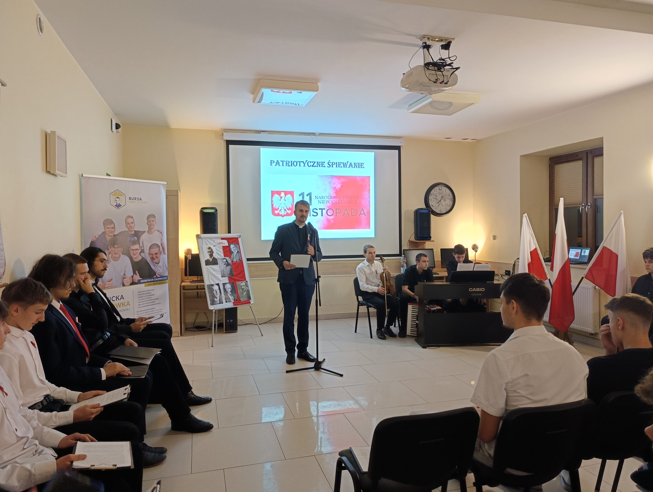 6 listopada, w naszej Bursie odbyło się wyjątkowe spotkanie poświęcone 107. rocznicy Odzyskania przez Polskę Niepodległości. To święto, obchodzone co roku 11 listopada, jest dla wszystkich Polaków szczególnym czasem refleksji, wdzięczności i dumy z historii naszego narodu. Wychowankowie Bursy postanowili uczcić to ważne piękne wydarzenie w sposób szczególny, organizując wieczór z pieśnią patriotyczną. Wśród zaproszonych gości znaleźli się uczniowie mieszkający w sądeckich internatach wraz z wychowawcami, w tym Internatu Zespołu Szkół Sióstr Niepokalanek, Internatu Zespołu Szkół Elektryczno-Mechanicznych oraz Internatu Zespołu Szkół Katolickich. Wszystkich zebranych serdecznie przywitał Dyrektor Bursy – o. Damian Pawlik SI oraz przedstawiciel społeczności wychowanków, podkreślając znaczenie wspólnego pielęgnowania pamięci o bohaterach narodowych. Uroczysty wieczór rozpoczęto od wspólnego odśpiewania Hymnu Narodowego, który wprowadził uczestników w podniosły, patriotyczny nastrój. Następnie nadszedł czas na wspólne śpiewanie pieśni żołnierskich i patriotycznych przy akompaniamencie niezastąpionej, bursowej kapeli. Wspólne muzykowanie stało się okazją nie tylko do integracji, lecz także do refleksji nad tym, czym dla każdego z nas jest patriotyzm. Zwieńczeniem tego pięknego wieczoru był wspólny poczęstunek – aromatyczna zimowa herbatka oraz smakołyki przygotowane przez nasze panie kucharki. W ciepłej, serdecznej atmosferze trwały rozmowy, śmiechy i dalsze śpiewanie, które połączyło wszystkich uczestników w duchu wspólnoty i wdzięczności za wolną Polskę.