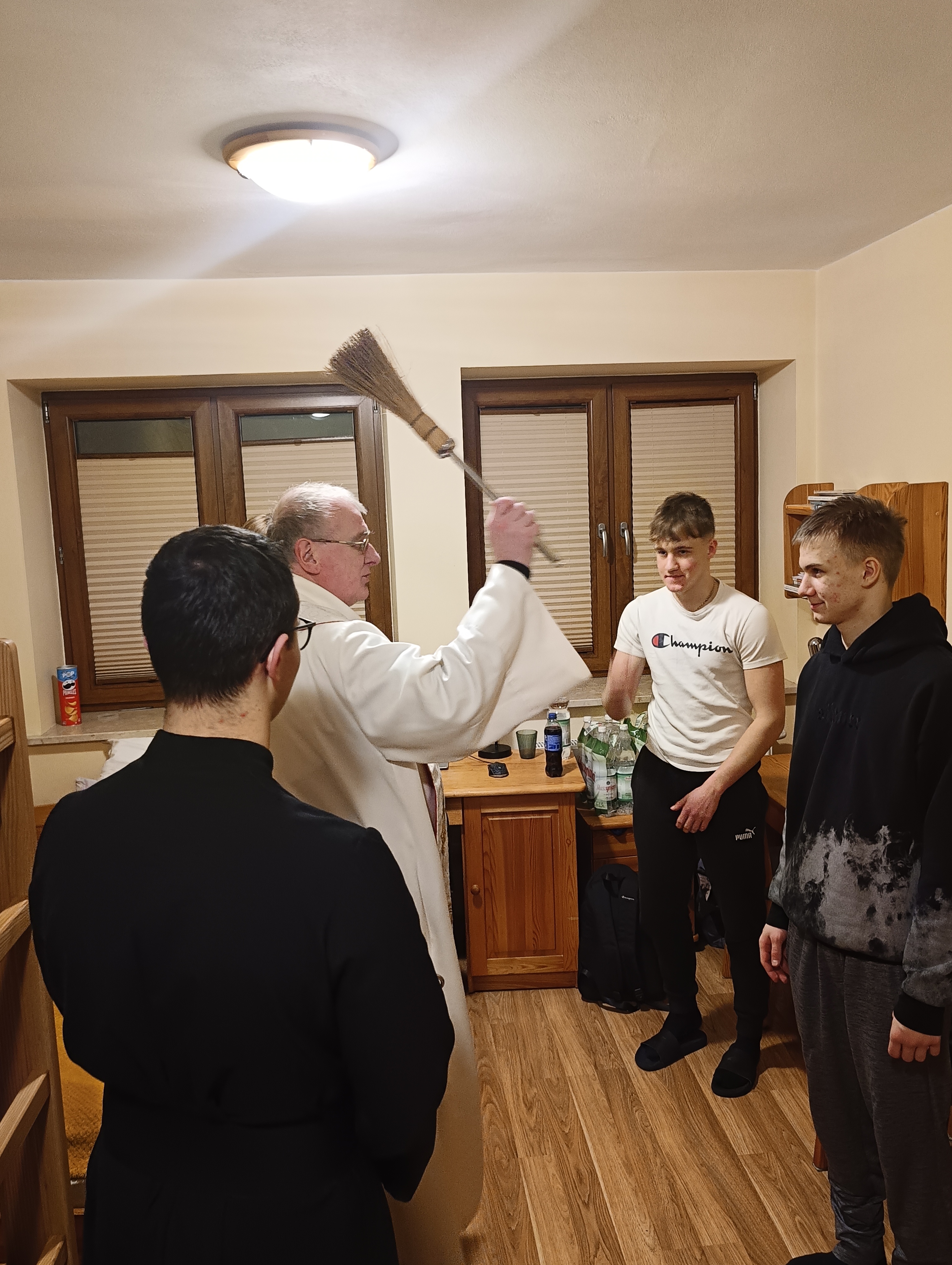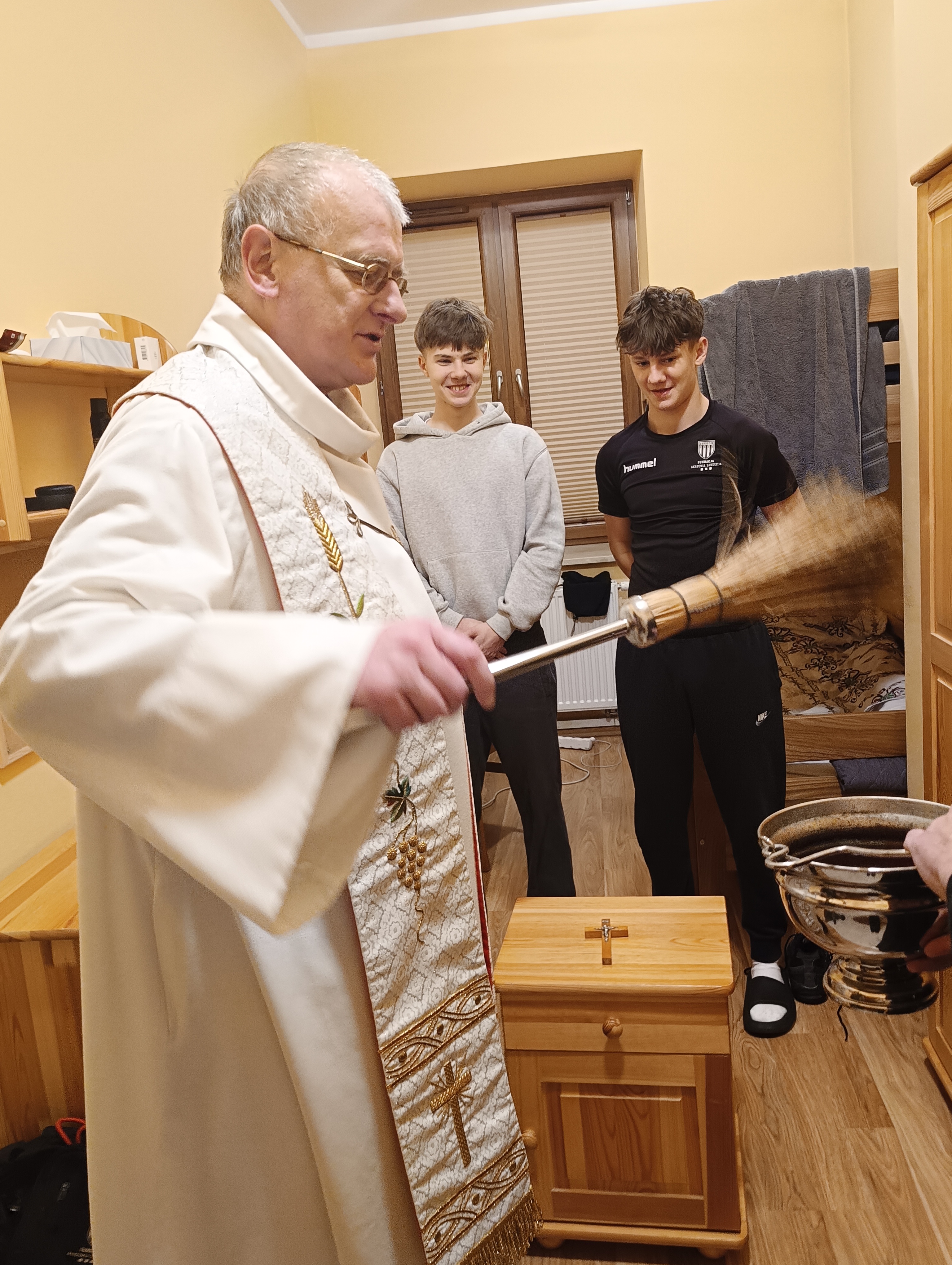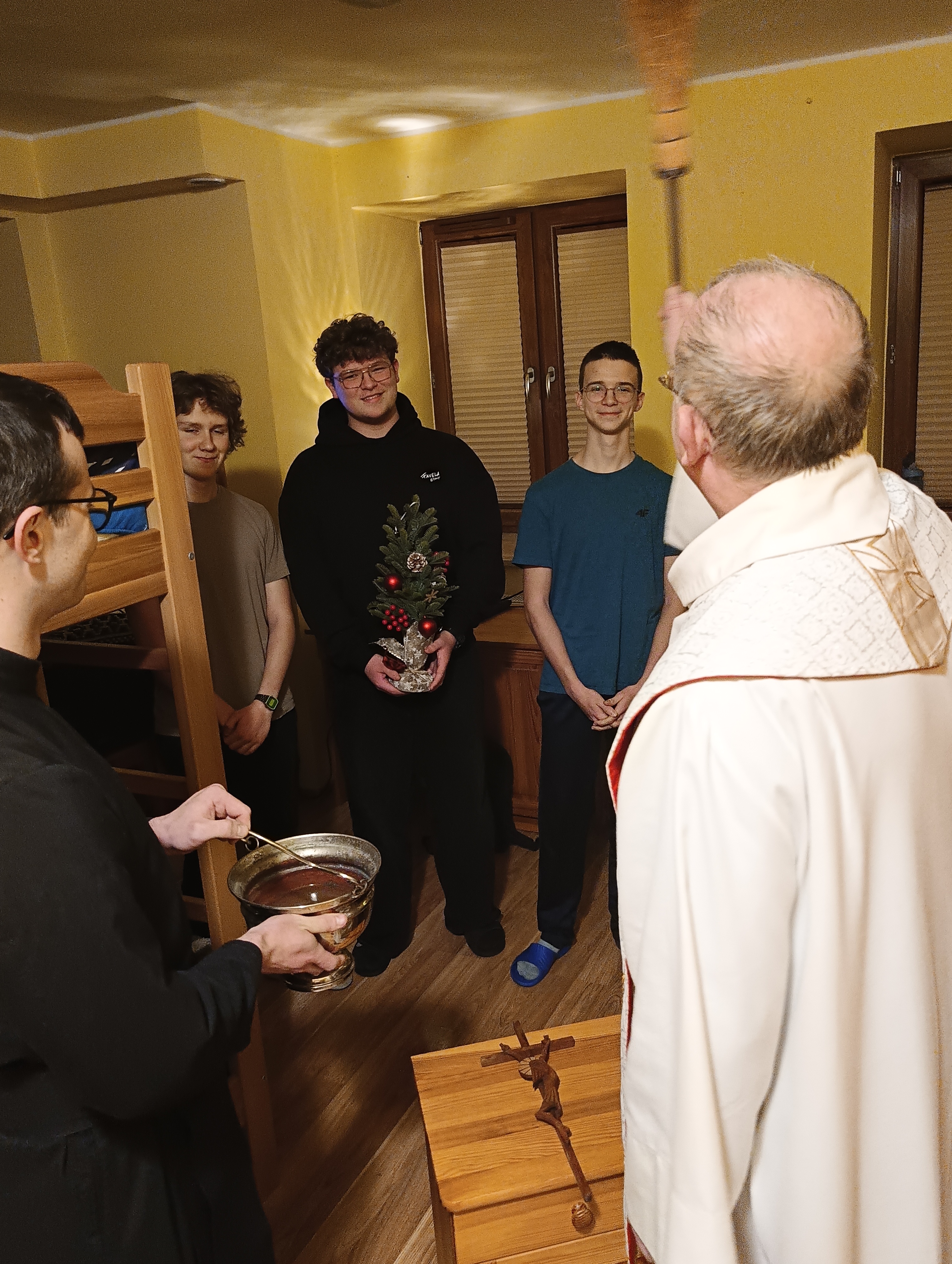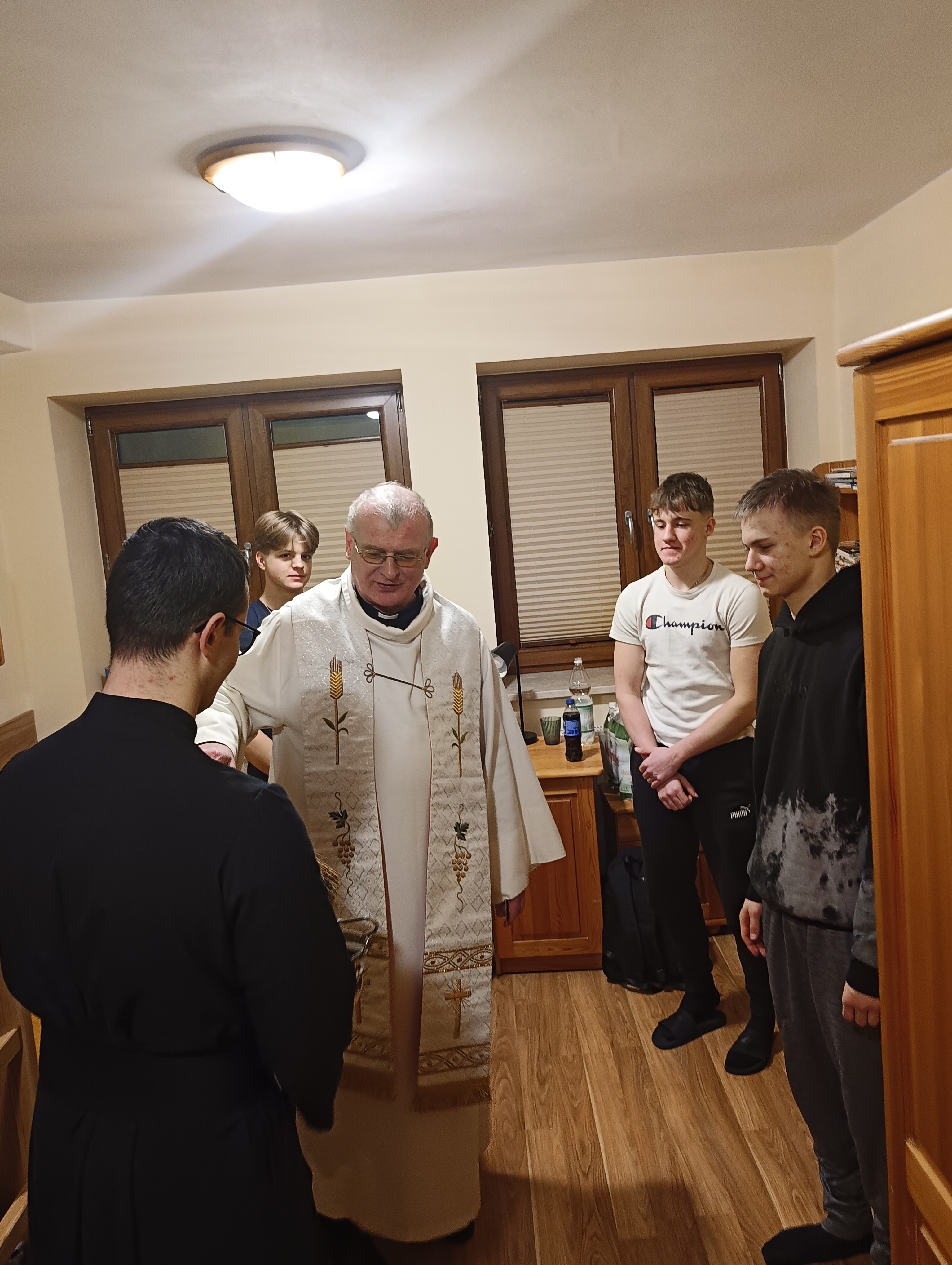 Kolęda, czyli wizyta duszpasterska w naszej Bursie była wyjątkowym wydarzeniem, które wprowadziło wszystkich mieszkańców w atmosferę wspólnoty, modlitwy i radości. Spotkanie rozpoczęliśmy w holu głównym, gdzie zgromadzili się dyrektor, wychowankowie i wychowawcy. Kolędę prowadził ksiądz proboszcz, ojciec Tadeusz Kukułka SI, któremu asystował Prefekt, ksiądz Janek Głąba SI. Już od pierwszych chwil dało się odczuć podniosły, a zarazem serdeczny charakter spotkania. Na początku wszyscy wspólnie odmówiliśmy modlitwę, prosząc o Boże błogosławieństwo na nowy rok, zdrowie, pokój oraz wzajemną życzliwość. Po wspólnej modlitwie nastąpiła część indywidualna kolędy. Ojciec Tadeusz wraz z księdzem Jankiem odwiedzali każdy pokój wychowanków i pomieszczenia Bursy. W trakcie tych krótkich spotkań chłopcy mieli okazję do osobistej rozmowy, wspólnej modlitwy oraz przyjęcia błogosławieństwa. Był to czas bardziej intymny, sprzyjający refleksji i zadumie. Po zakończeniu wizyty duszpasterskiej wszyscy zostali zaproszeni na poczęstunek do sali multimedialnej. Przy wspólnym stole panowała radosna i swobodna atmosfera. Był to moment rozmów, śmiechu i integracji, który dopełnił całe wydarzenie i sprawił, że kolęda na długo pozostanie w naszej pamięci.