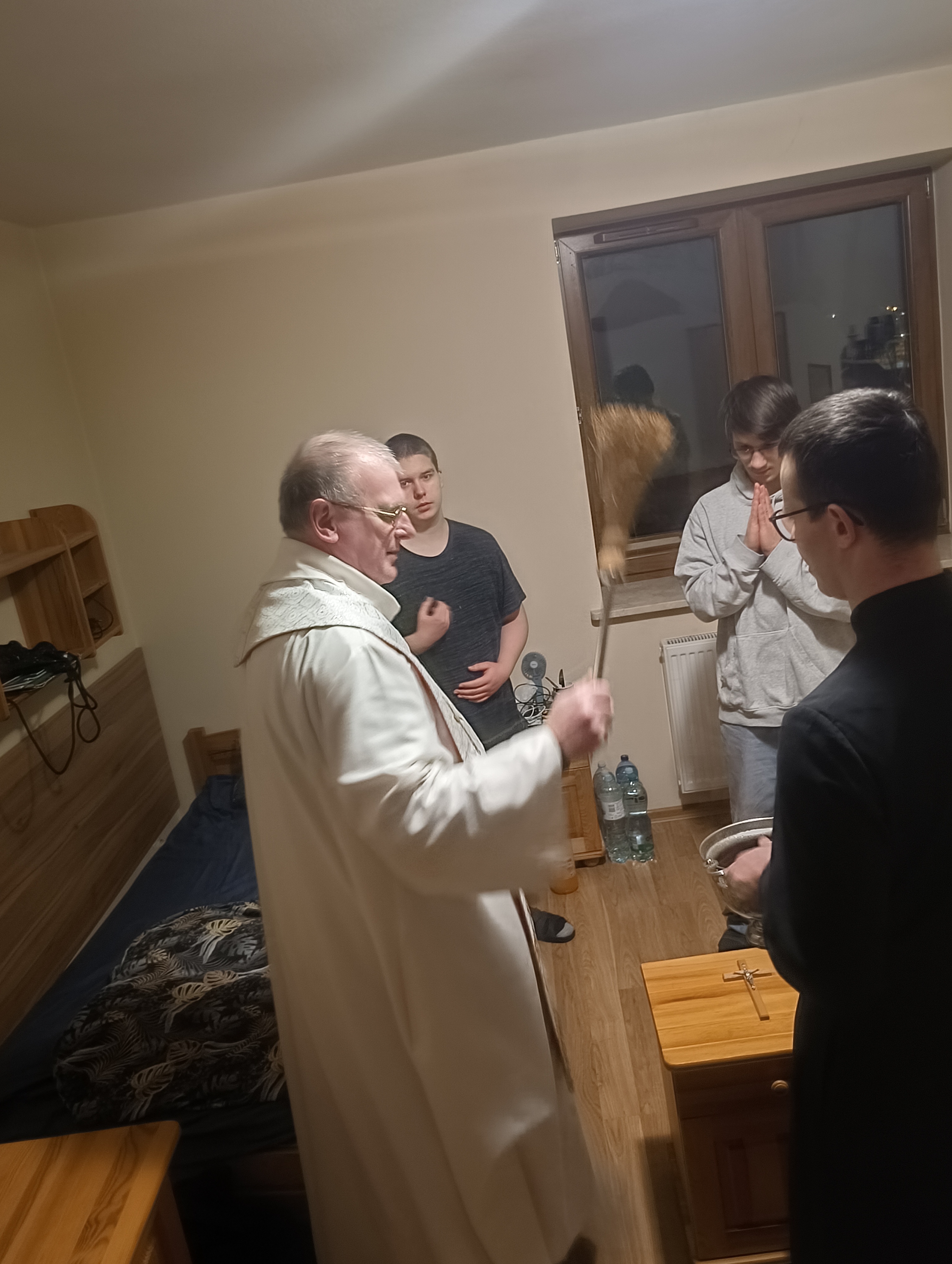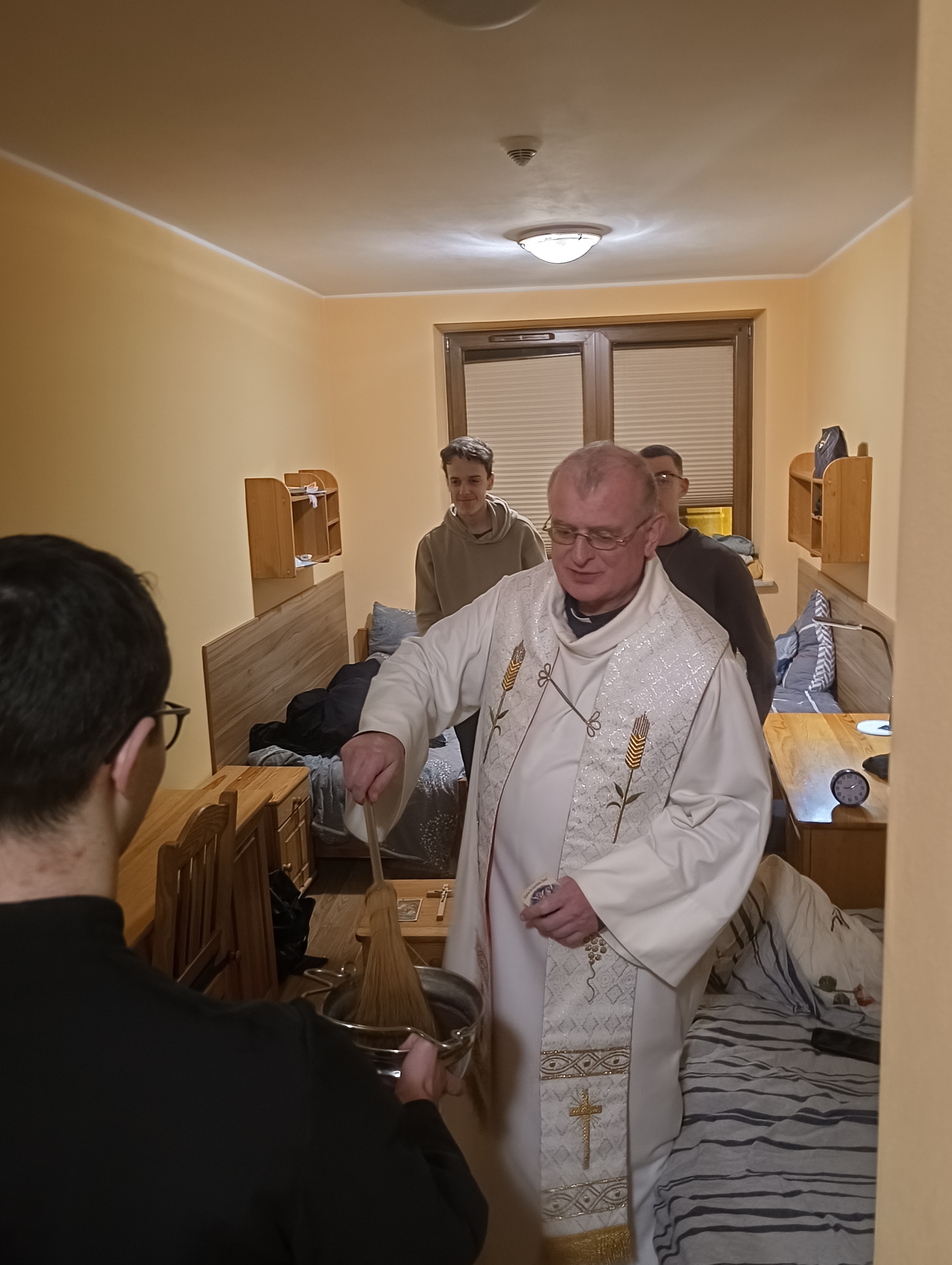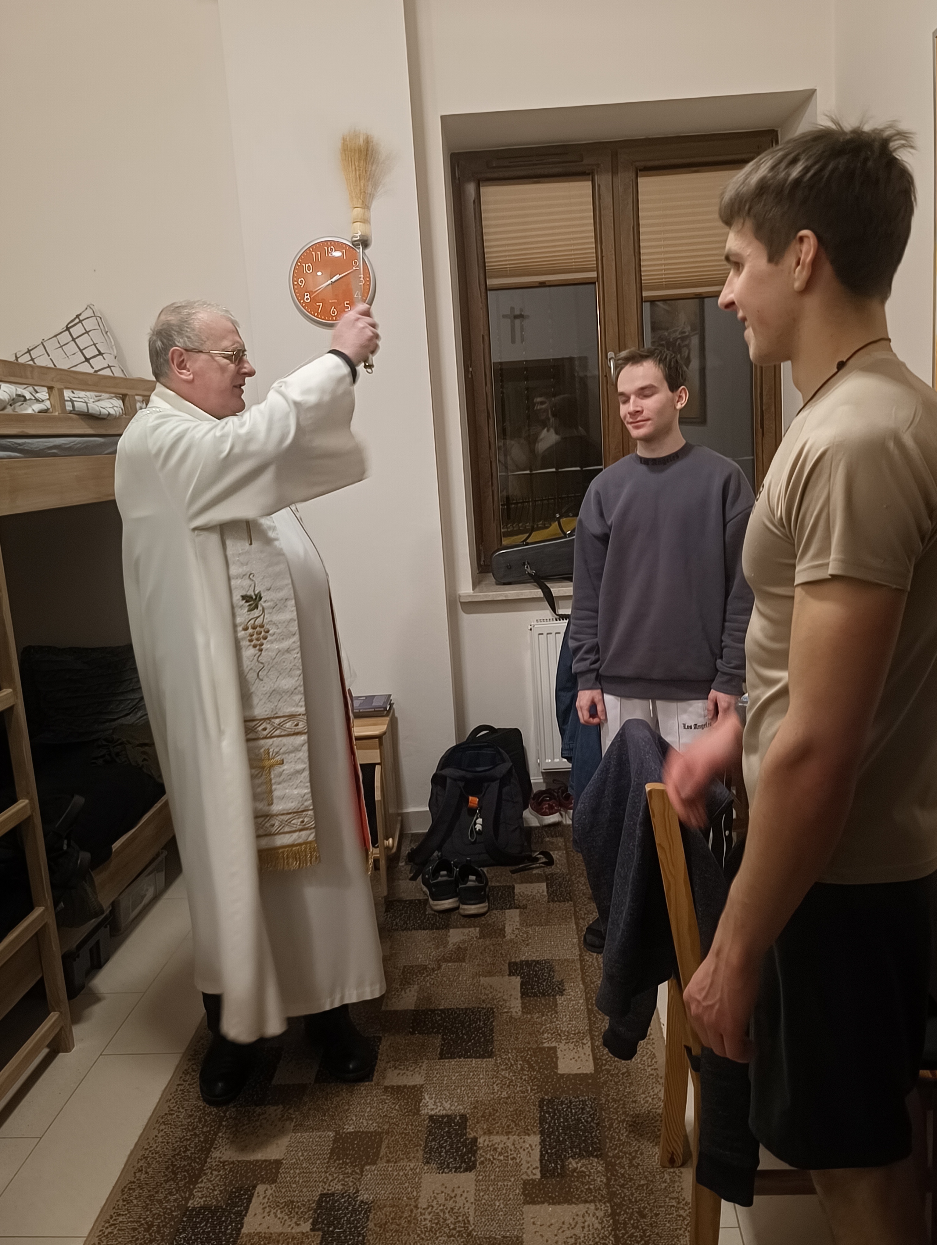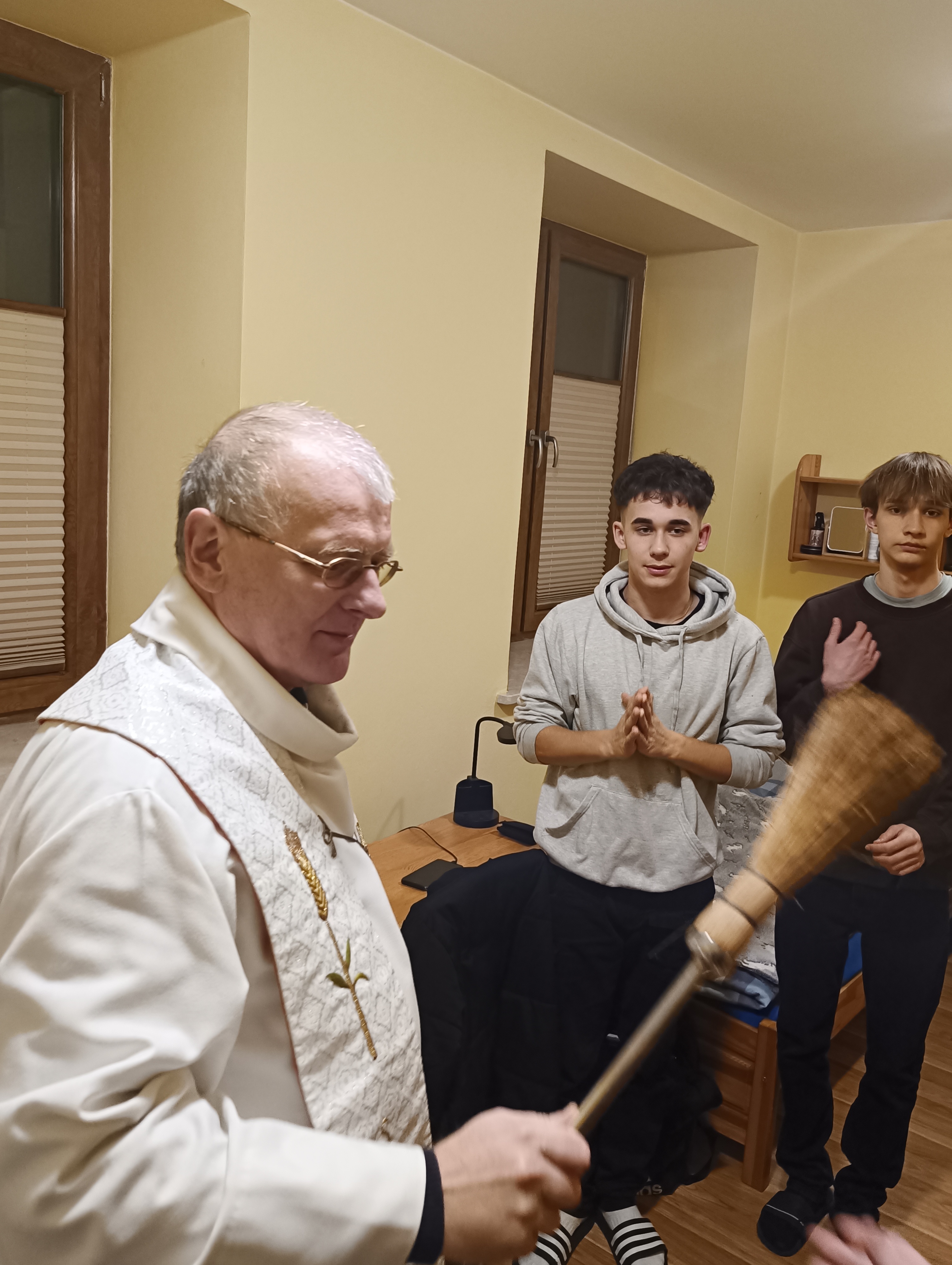 Kolęda, czyli wizyta duszpasterska w naszej Bursie była wyjątkowym wydarzeniem, które wprowadziło wszystkich mieszkańców w atmosferę wspólnoty, modlitwy i radości. Spotkanie rozpoczęliśmy w holu głównym, gdzie zgromadzili się dyrektor, wychowankowie i wychowawcy. Kolędę prowadził ksiądz proboszcz, ojciec Tadeusz Kukułka SI, któremu asystował Prefekt, ksiądz Janek Głąba SI. Już od pierwszych chwil dało się odczuć podniosły, a zarazem serdeczny charakter spotkania. Na początku wszyscy wspólnie odmówiliśmy modlitwę, prosząc o Boże błogosławieństwo na nowy rok, zdrowie, pokój oraz wzajemną życzliwość. Po wspólnej modlitwie nastąpiła część indywidualna kolędy. Ojciec Tadeusz wraz z księdzem Jankiem odwiedzali każdy pokój wychowanków i pomieszczenia Bursy. W trakcie tych krótkich spotkań chłopcy mieli okazję do osobistej rozmowy, wspólnej modlitwy oraz przyjęcia błogosławieństwa. Był to czas bardziej intymny, sprzyjający refleksji i zadumie. Po zakończeniu wizyty duszpasterskiej wszyscy zostali zaproszeni na poczęstunek do sali multimedialnej. Przy wspólnym stole panowała radosna i swobodna atmosfera. Był to moment rozmów, śmiechu i integracji, który dopełnił całe wydarzenie i sprawił, że kolęda na długo pozostanie w naszej pamięci.