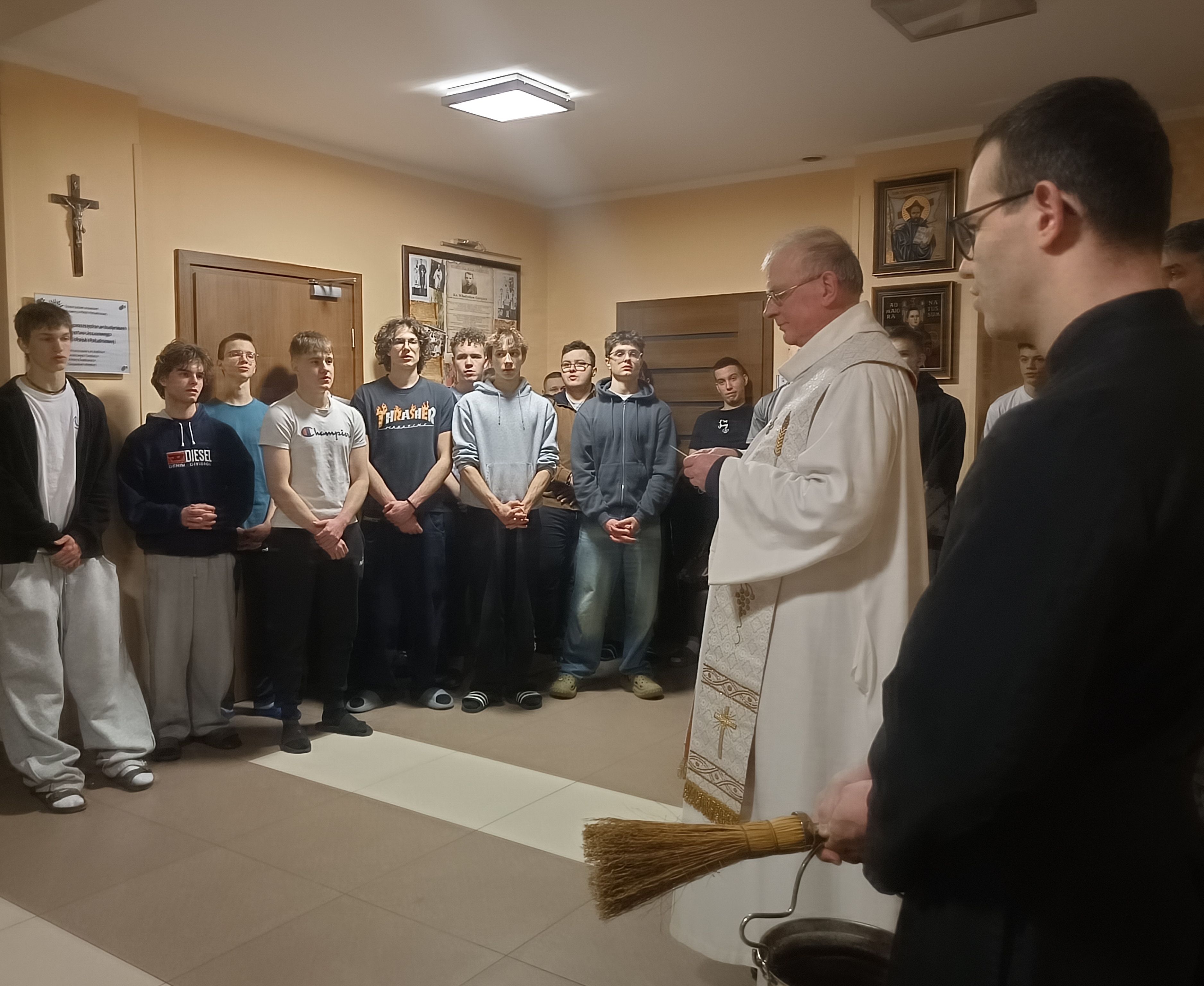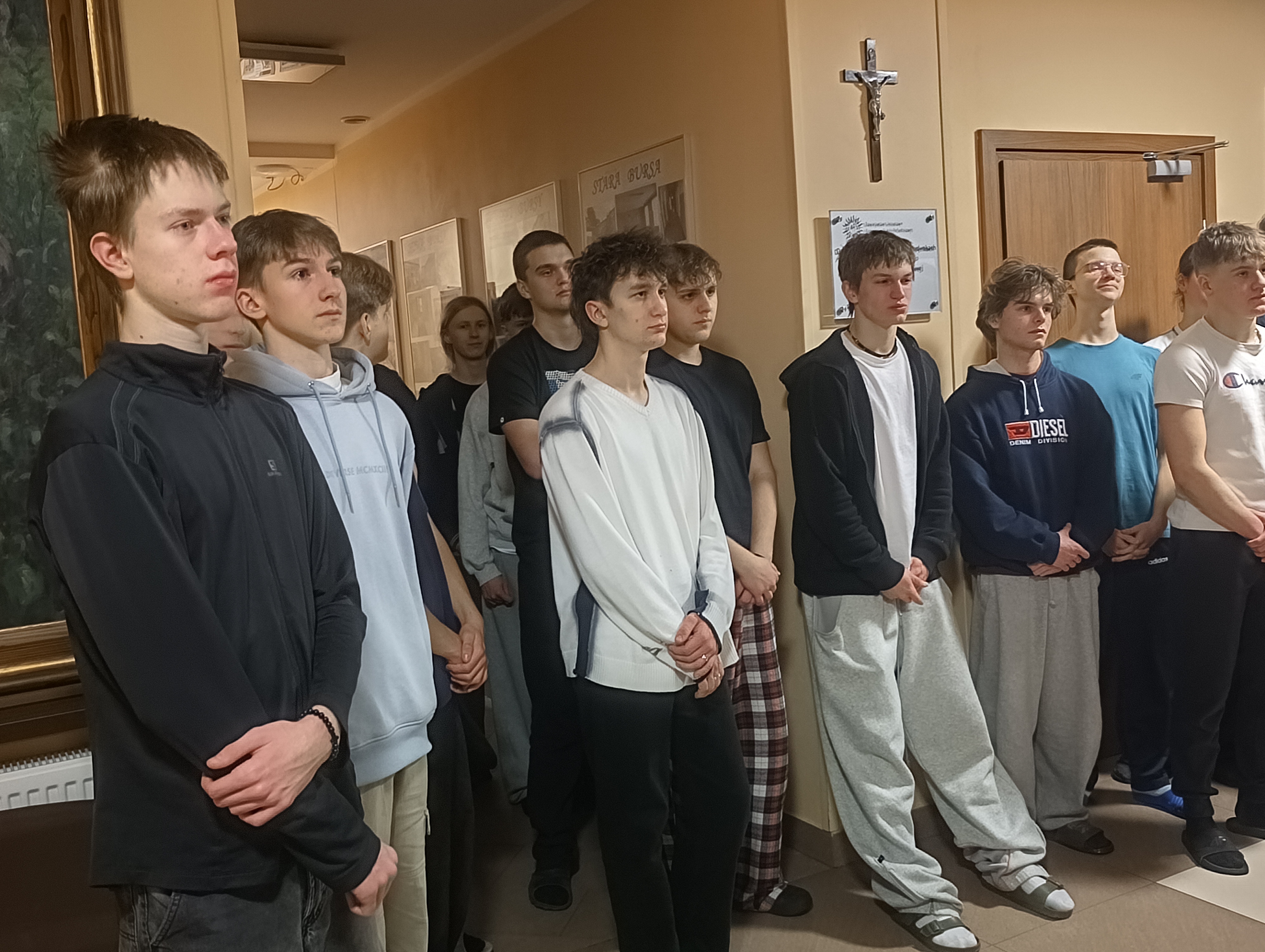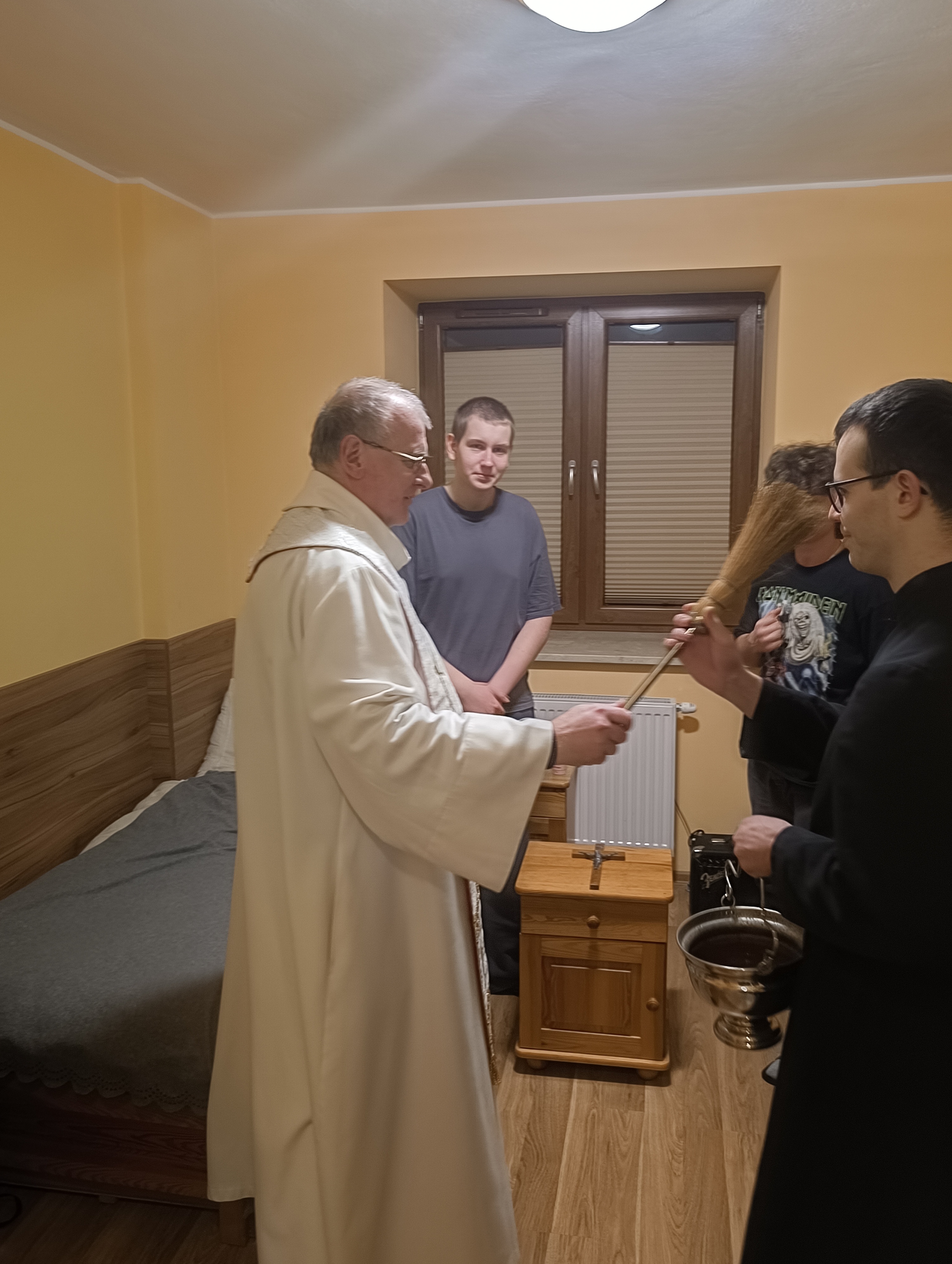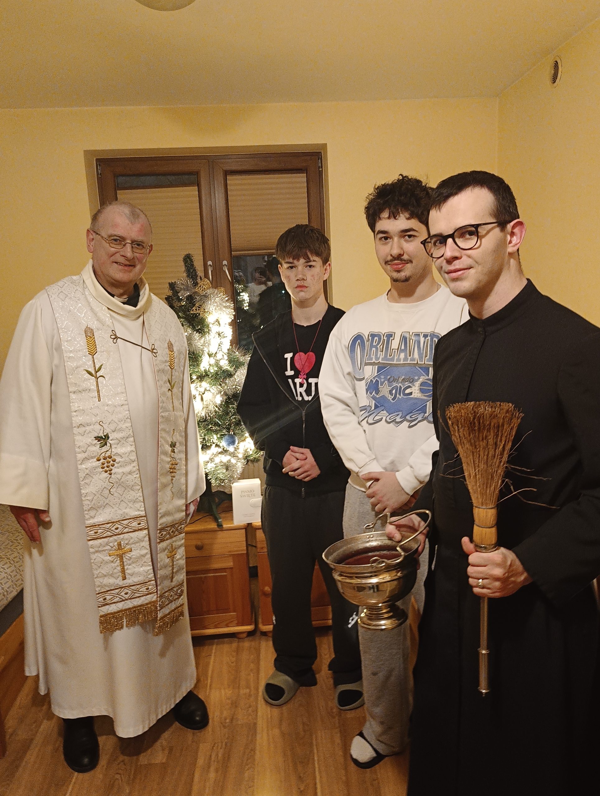Kolęda, czyli wizyta duszpasterska w naszej Bursie była wyjątkowym wydarzeniem, które wprowadziło wszystkich mieszkańców w atmosferę wspólnoty, modlitwy i radości. Spotkanie rozpoczęliśmy w holu głównym, gdzie zgromadzili się dyrektor, wychowankowie i wychowawcy. Kolędę prowadził ksiądz proboszcz, ojciec Tadeusz Kukułka SI, któremu asystował Prefekt, ksiądz Janek Głąba SI. Już od pierwszych chwil dało się odczuć podniosły, a zarazem serdeczny charakter spotkania. Na początku wszyscy wspólnie odmówiliśmy modlitwę, prosząc o Boże błogosławieństwo na nowy rok, zdrowie, pokój oraz wzajemną życzliwość. Po wspólnej modlitwie nastąpiła część indywidualna kolędy. Ojciec Tadeusz wraz z księdzem Jankiem odwiedzali każdy pokój wychowanków i pomieszczenia Bursy. W trakcie tych krótkich spotkań chłopcy mieli okazję do osobistej rozmowy, wspólnej modlitwy oraz przyjęcia błogosławieństwa. Był to czas bardziej intymny, sprzyjający refleksji i zadumie. Po zakończeniu wizyty duszpasterskiej wszyscy zostali zaproszeni na poczęstunek do sali multimedialnej. Przy wspólnym stole panowała radosna i swobodna atmosfera. Był to moment rozmów, śmiechu i integracji, który dopełnił całe wydarzenie i sprawił, że kolęda na długo pozostanie w naszej pamięci.