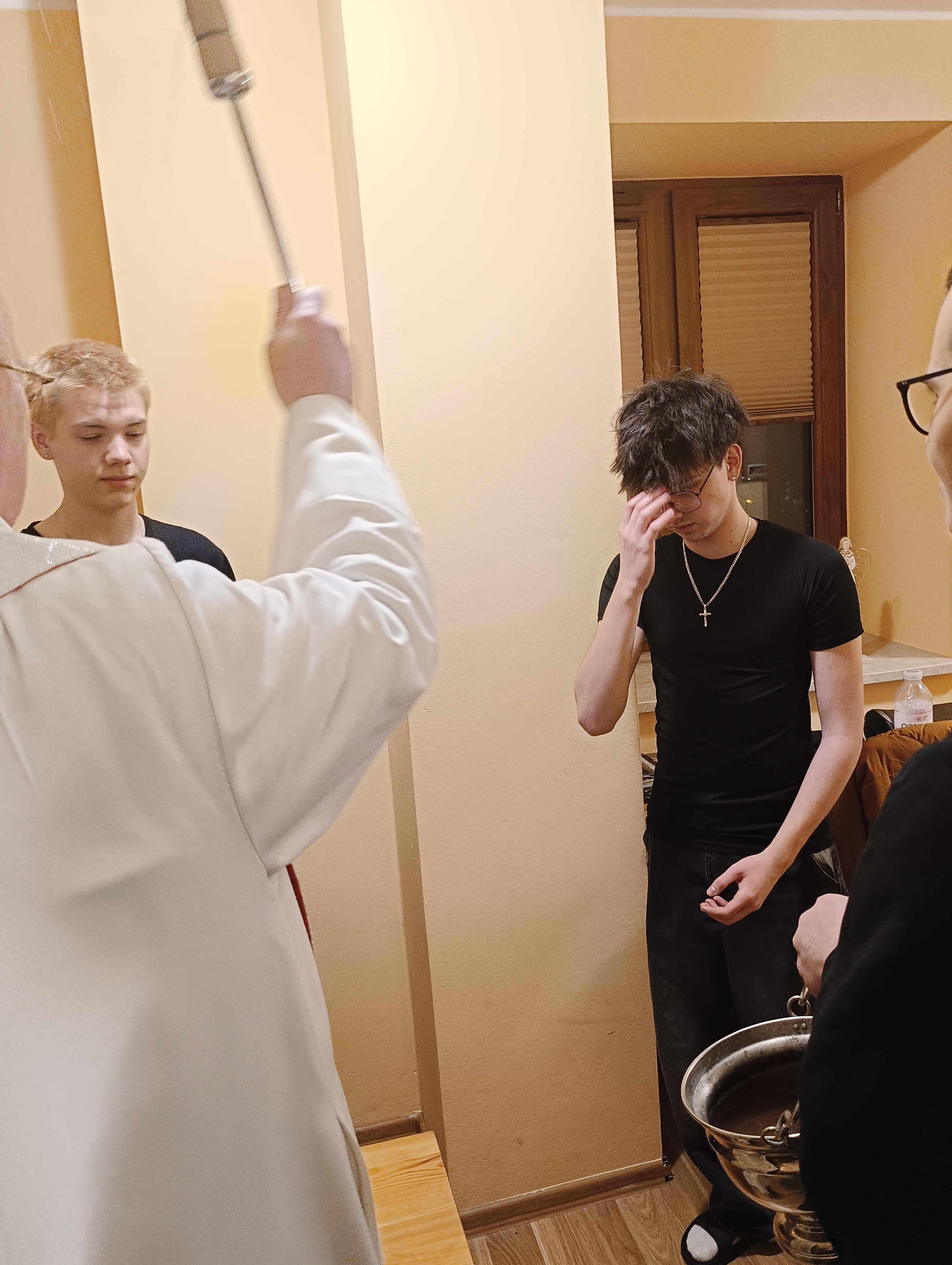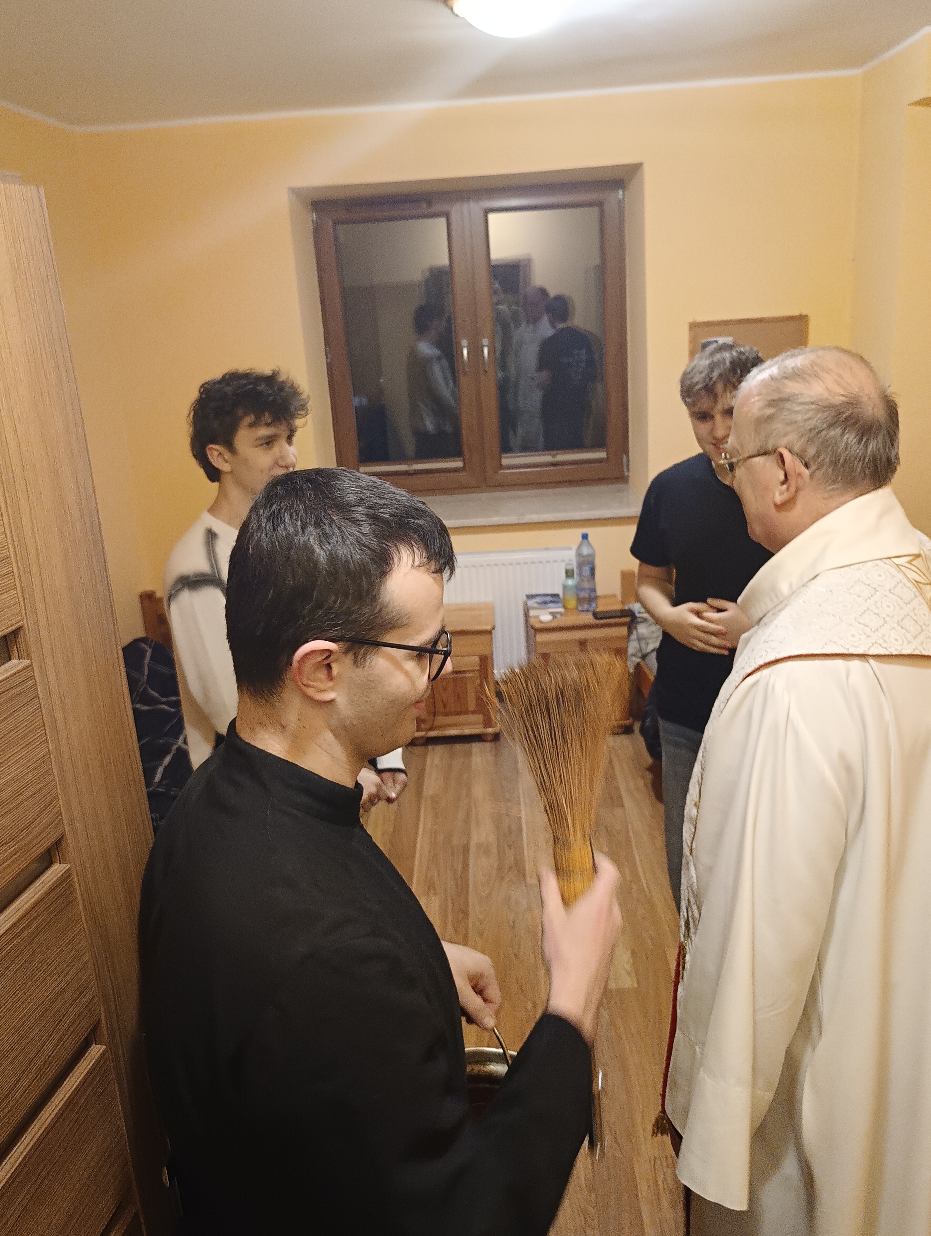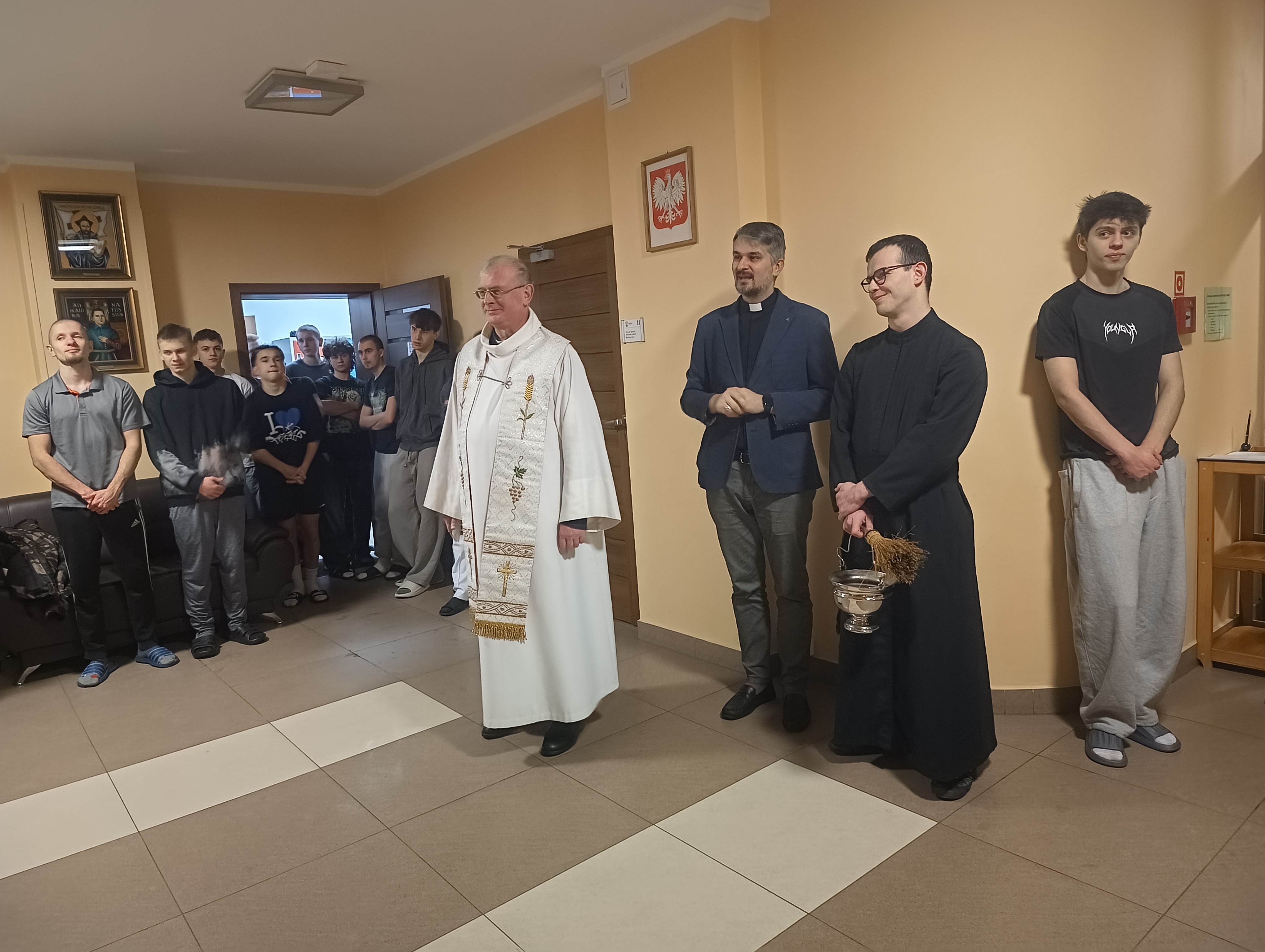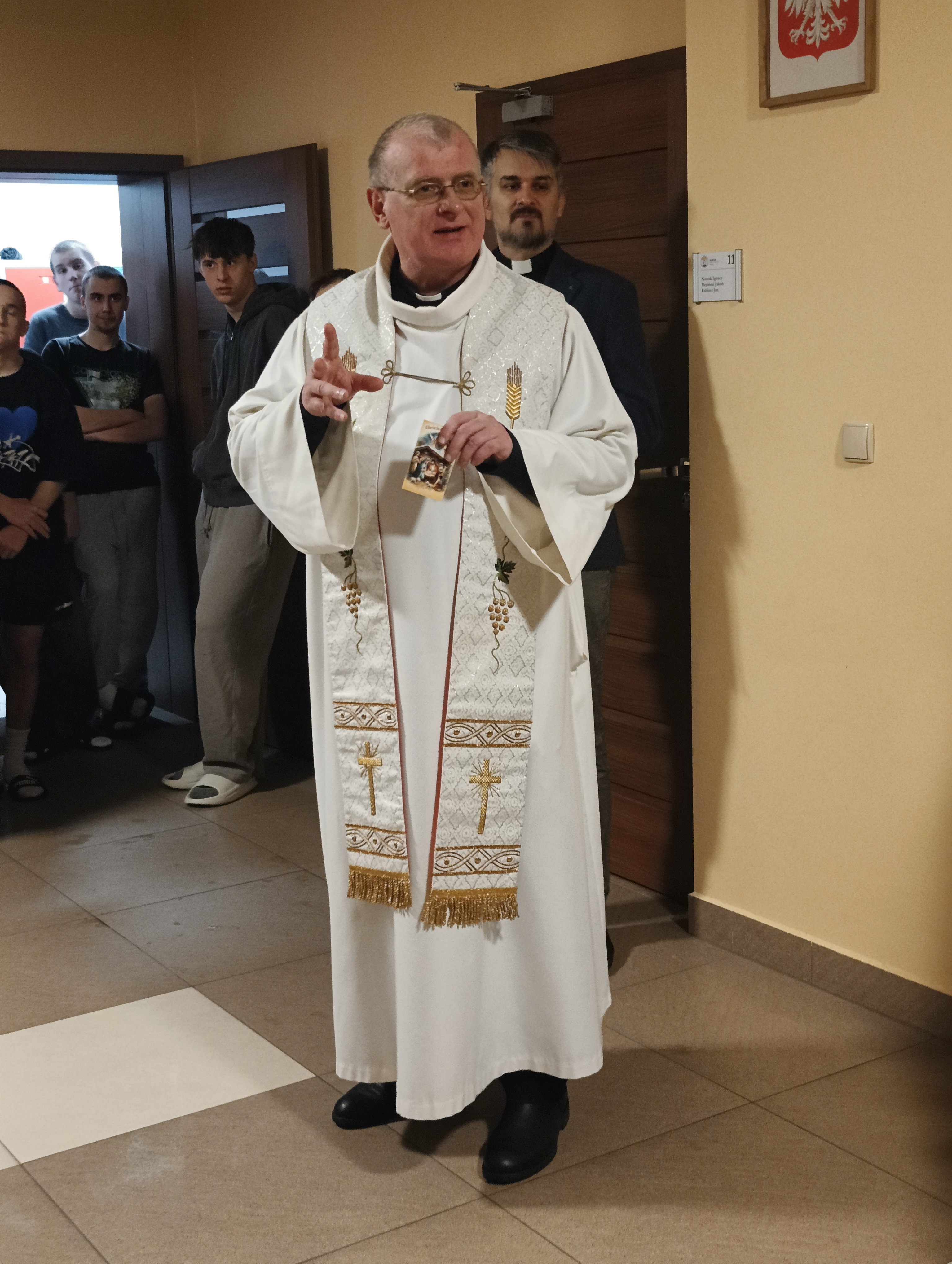 Kolęda, czyli wizyta duszpasterska w naszej Bursie była wyjątkowym wydarzeniem, które wprowadziło wszystkich mieszkańców w atmosferę wspólnoty, modlitwy i radości. Spotkanie rozpoczęliśmy w holu głównym, gdzie zgromadzili się dyrektor, wychowankowie i wychowawcy. Kolędę prowadził ksiądz proboszcz, ojciec Tadeusz Kukułka SI, któremu asystował Prefekt, ksiądz Janek Głąba SI. Już od pierwszych chwil dało się odczuć podniosły, a zarazem serdeczny charakter spotkania. Na początku wszyscy wspólnie odmówiliśmy modlitwę, prosząc o Boże błogosławieństwo na nowy rok, zdrowie, pokój oraz wzajemną życzliwość. Po wspólnej modlitwie nastąpiła część indywidualna kolędy. Ojciec Tadeusz wraz z księdzem Jankiem odwiedzali każdy pokój wychowanków i pomieszczenia Bursy. W trakcie tych krótkich spotkań chłopcy mieli okazję do osobistej rozmowy, wspólnej modlitwy oraz przyjęcia błogosławieństwa. Był to czas bardziej intymny, sprzyjający refleksji i zadumie. Po zakończeniu wizyty duszpasterskiej wszyscy zostali zaproszeni na poczęstunek do sali multimedialnej. Przy wspólnym stole panowała radosna i swobodna atmosfera. Był to moment rozmów, śmiechu i integracji, który dopełnił całe wydarzenie i sprawił, że kolęda na długo pozostanie w naszej pamięci.