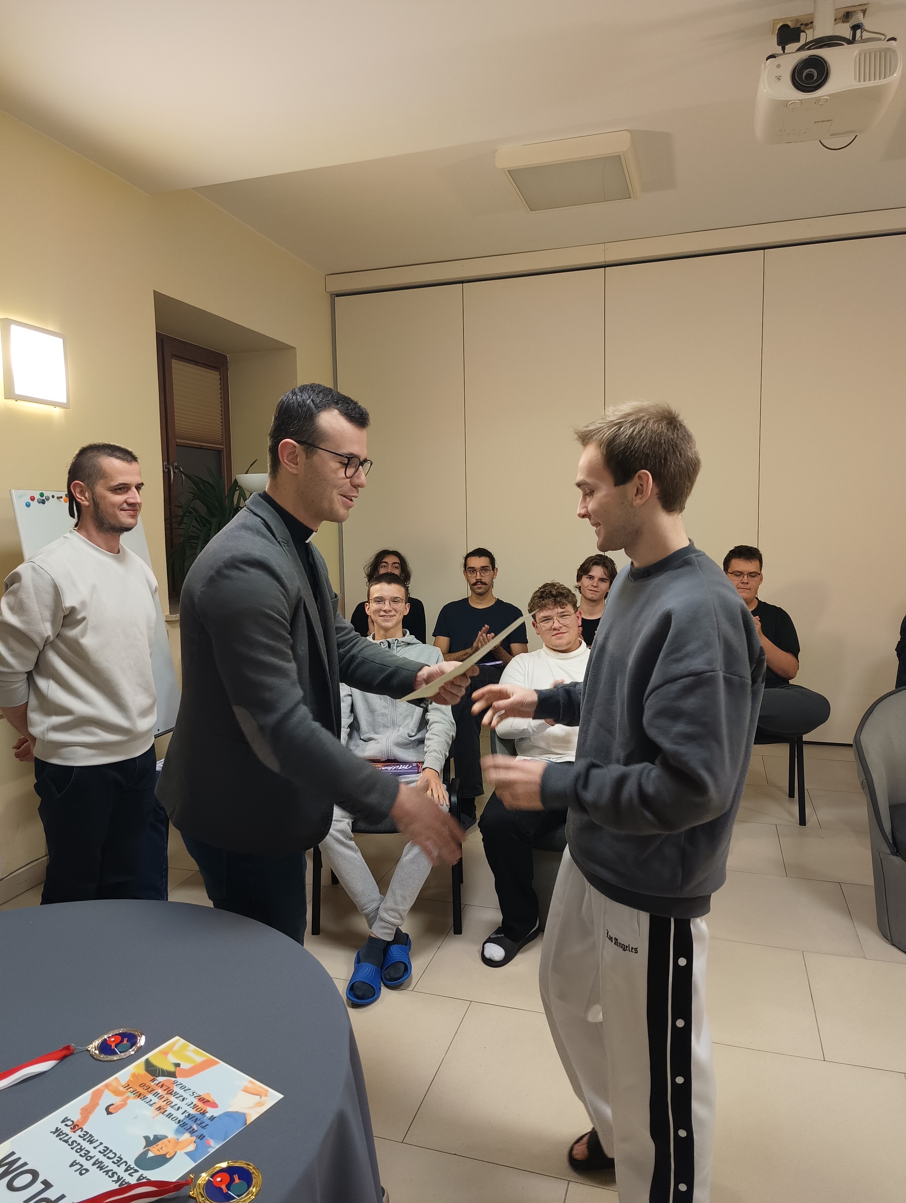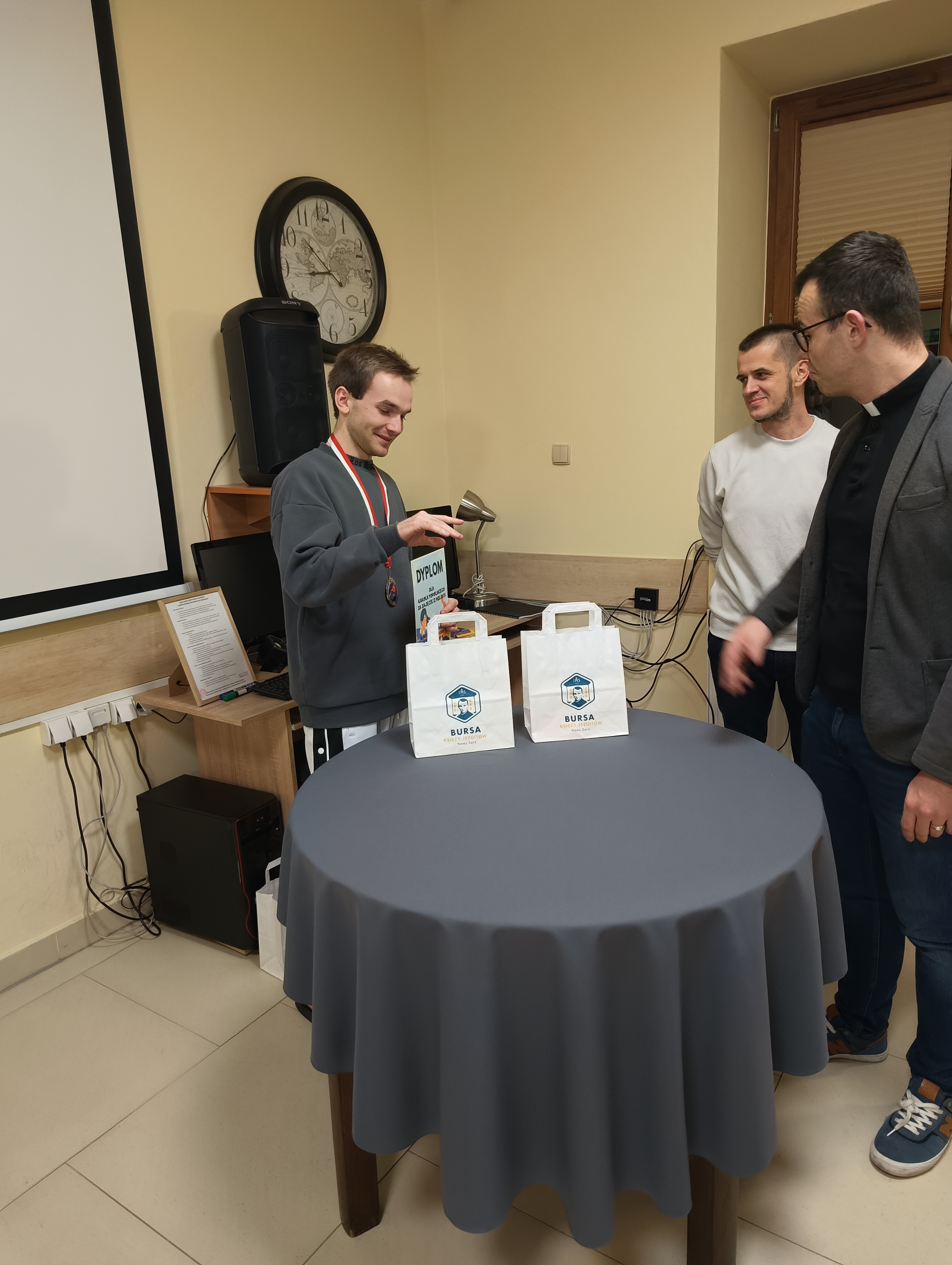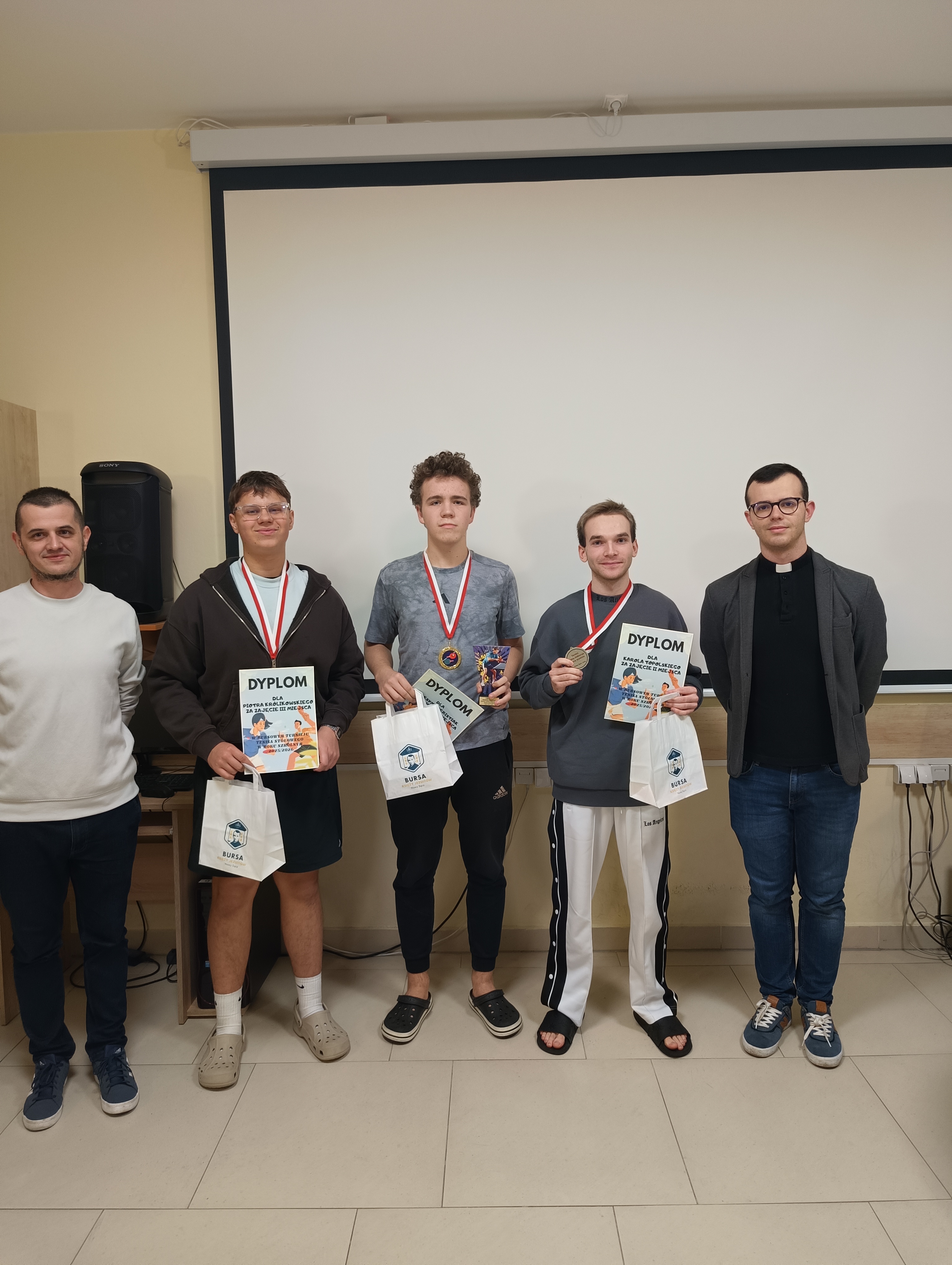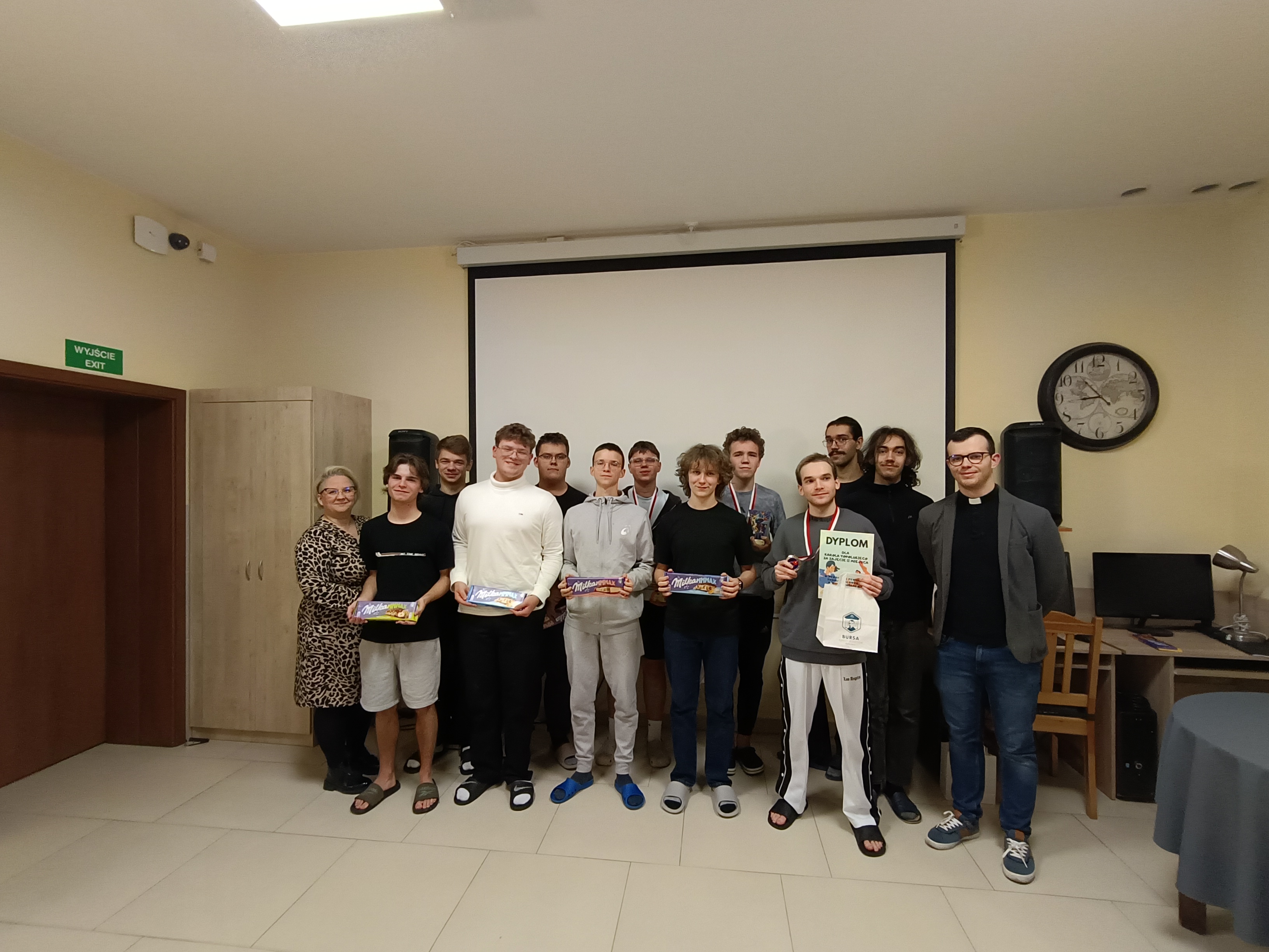 W czwartkowy wieczór, 4 grudnia, odbyło się uroczyste wręczenie nagród dla zwycięzców Turnieju Tenisa Stołowego, a także cząstkowych wyróżnień za szczególne dbanie o porządek w pokojach. Był to miły akcent podsumowujący ostatnie tygodnie aktywności wychowanków. Uroczystość poprowadził ksiądz Janek – Prefekt Bursy, który w imieniu Ojca Dyrektora Damiana przekazał nagrodzonym dyplomy oraz drobne upominki. W krótkim przemówieniu podkreślił zaangażowanie uczestników zarówno w rywalizację sportową, jak i w codzienne obowiązki związane z utrzymywaniem czystości. Atmosfera podczas spotkania była wyjątkowo serdeczna. Uczestnicy z zainteresowaniem wysłuchali ogłoszenia wyników, a radość zwycięzców udzielała się wszystkim obecnym. Największe brawa zebrał Maksym – triumfator turnieju. Oprócz głównej nagrody otrzymał także od Bursy firmową filiżankę jako symboliczne wyróżnienie za to, że stał się pomysłodawcą i nieformalnym inicjatorem wieczornych herbatek w pokoju wychowawców. Całe wydarzenie zakończyło się wspólnym zdjęciem, gratulacjami, rozmowami i dobrym nastrojem.