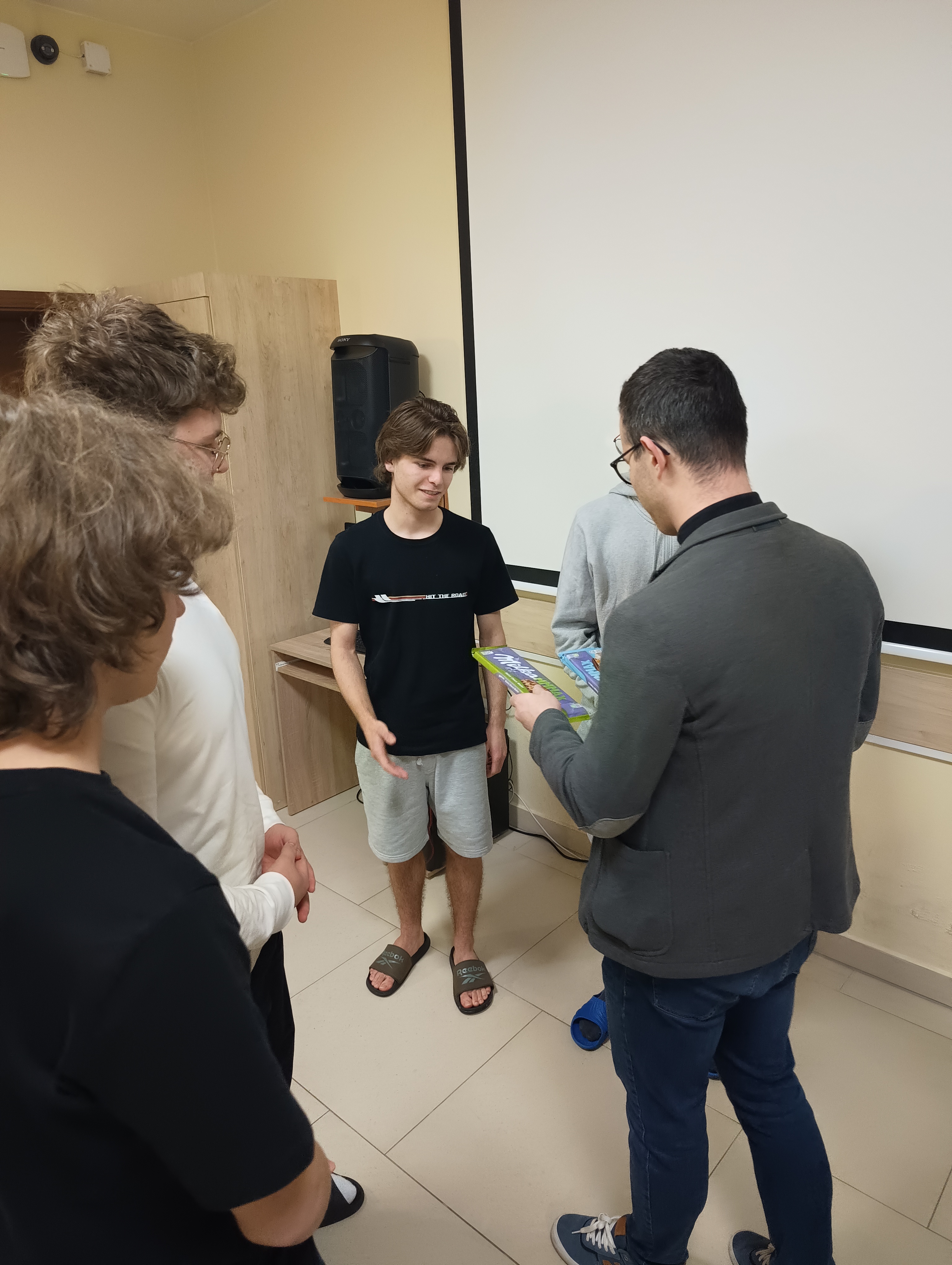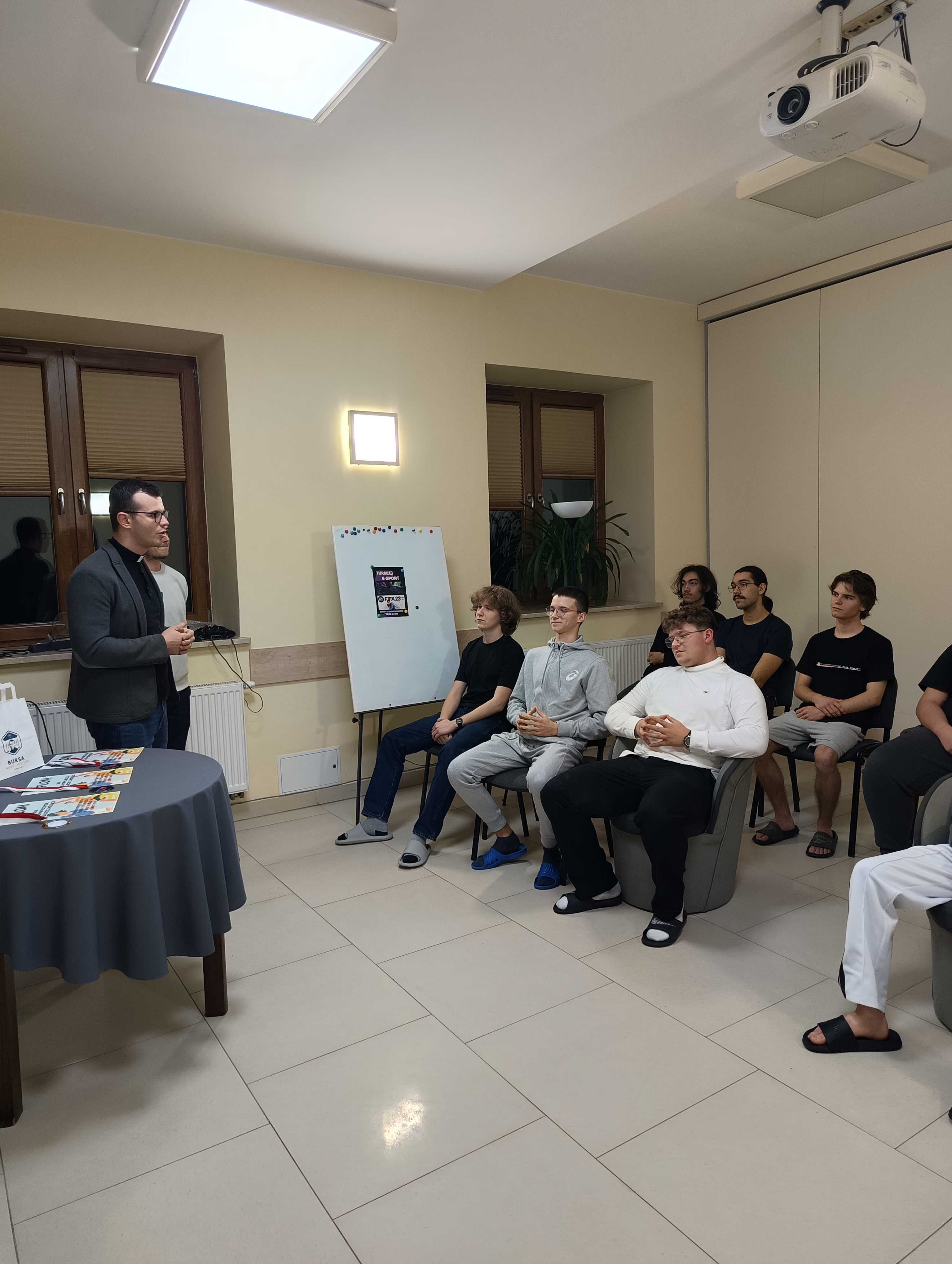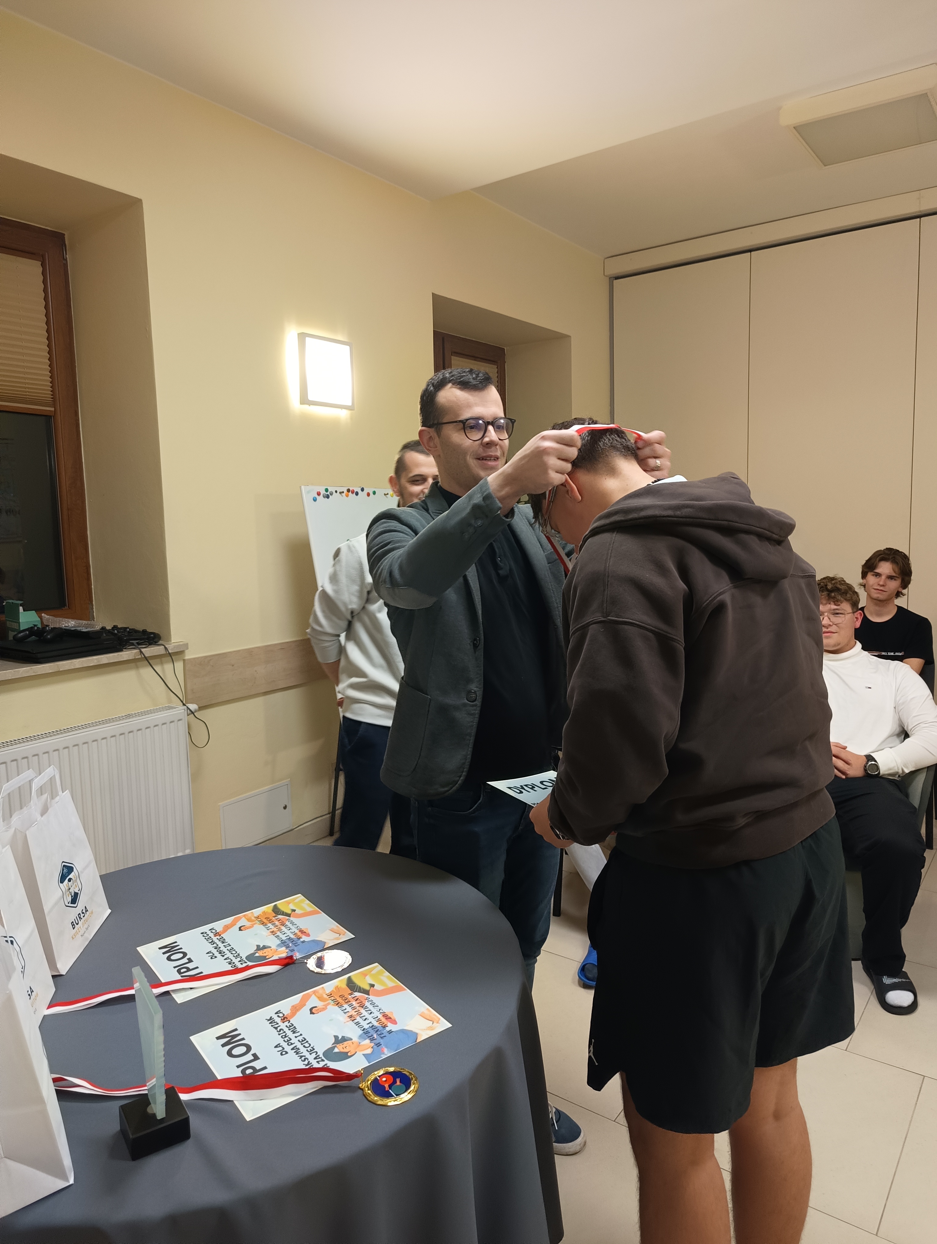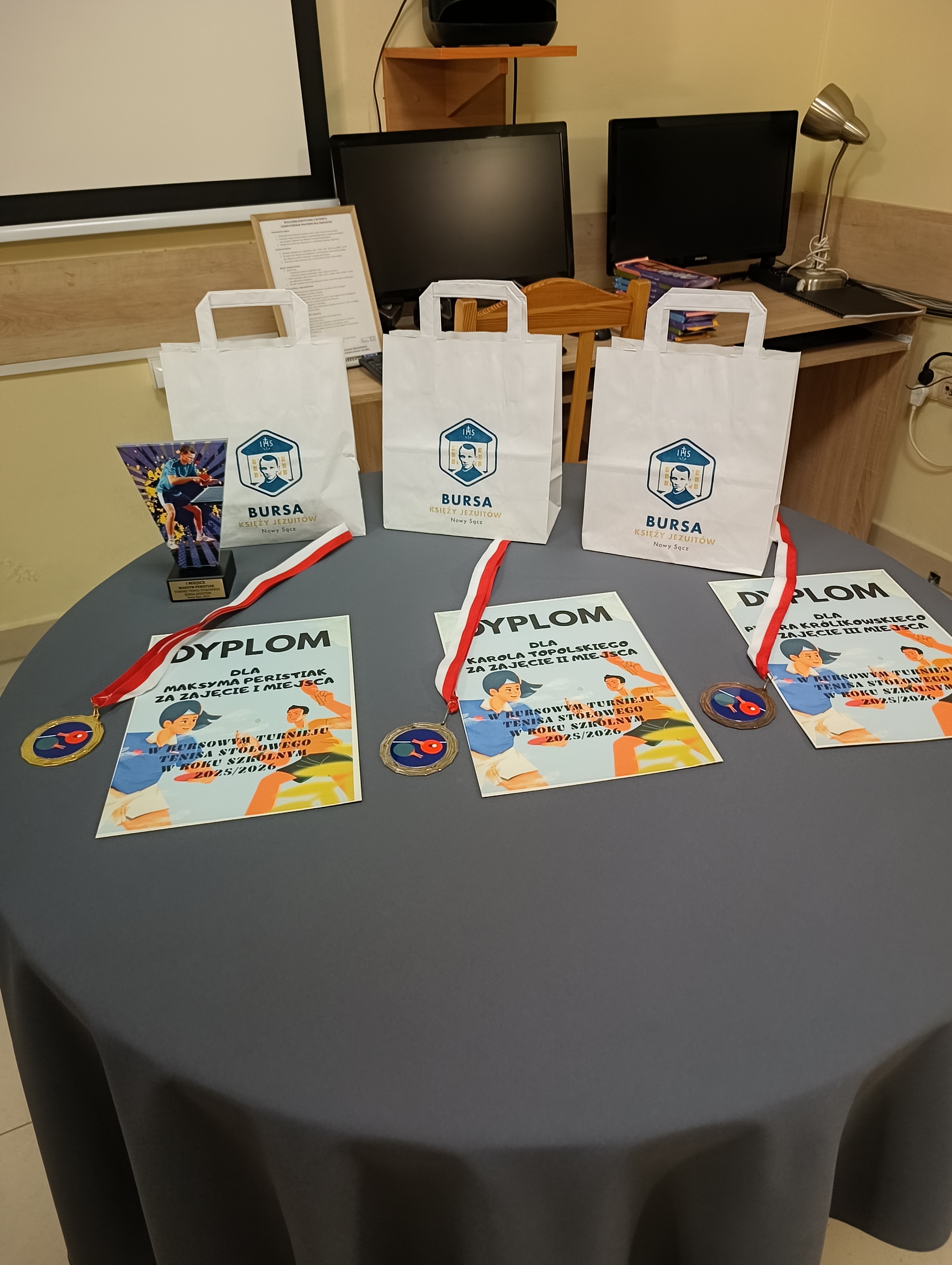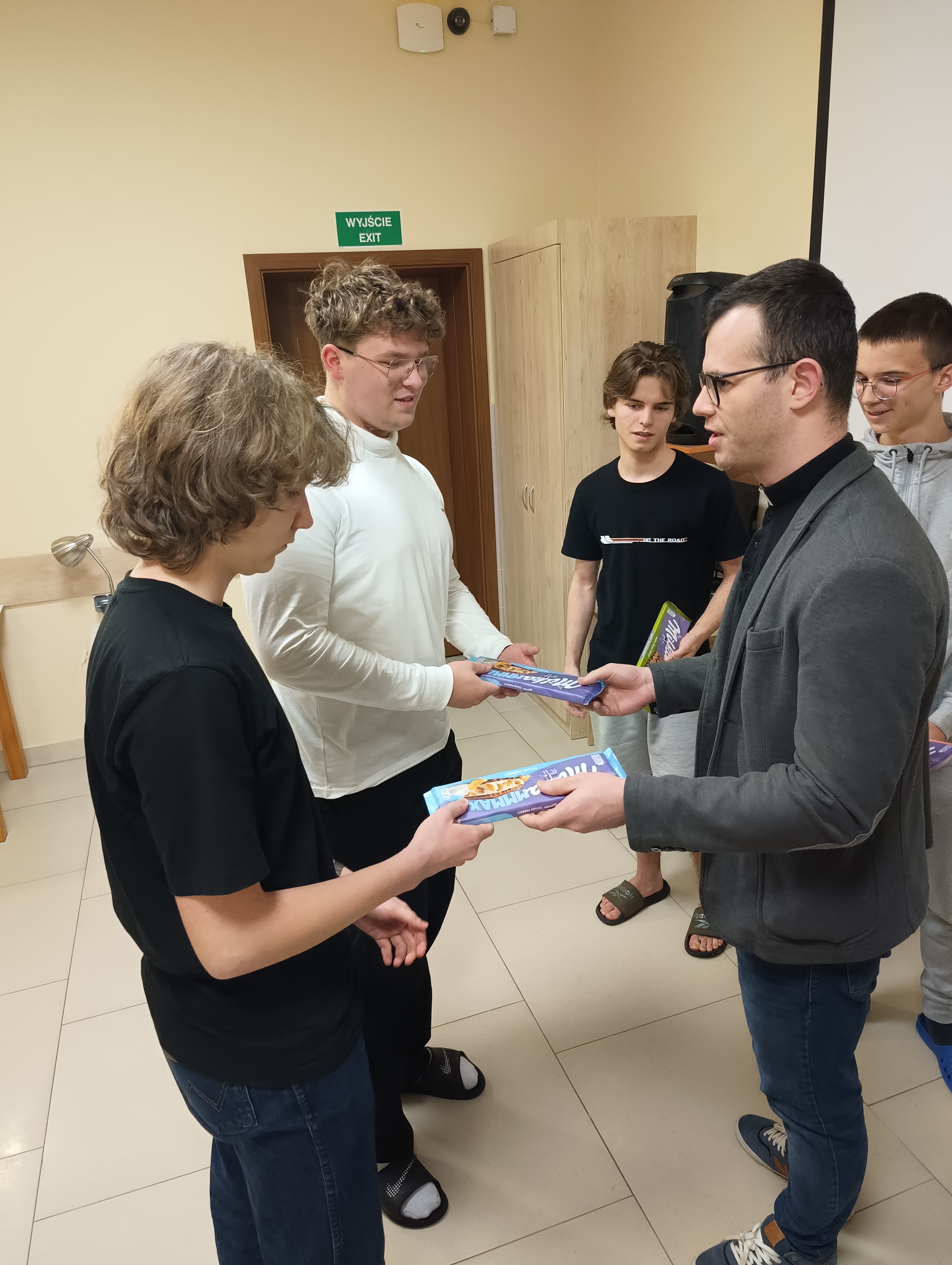 W czwartkowy wieczór, 4 grudnia, odbyło się uroczyste wręczenie nagród dla zwycięzców Turnieju Tenisa Stołowego, a także cząstkowych wyróżnień za szczególne dbanie o porządek w pokojach. Był to miły akcent podsumowujący ostatnie tygodnie aktywności wychowanków. Uroczystość poprowadził ksiądz Janek – Prefekt Bursy, który w imieniu Ojca Dyrektora Damiana przekazał nagrodzonym dyplomy oraz drobne upominki. W krótkim przemówieniu podkreślił zaangażowanie uczestników zarówno w rywalizację sportową, jak i w codzienne obowiązki związane z utrzymywaniem czystości. Atmosfera podczas spotkania była wyjątkowo serdeczna. Uczestnicy z zainteresowaniem wysłuchali ogłoszenia wyników, a radość zwycięzców udzielała się wszystkim obecnym. Największe brawa zebrał Maksym – triumfator turnieju. Oprócz głównej nagrody otrzymał także od Bursy firmową filiżankę jako symboliczne wyróżnienie za to, że stał się pomysłodawcą i nieformalnym inicjatorem wieczornych herbatek w pokoju wychowawców. Całe wydarzenie zakończyło się wspólnym zdjęciem, gratulacjami, rozmowami i dobrym nastrojem.